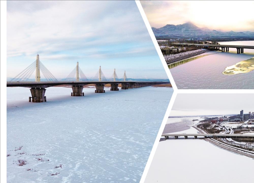 雪后晴空下的乌海,冰封的河面如银练铺展,桥梁道路在皑皑白雪中相互交织,银装素裹间,尽显北方城市的开阔与静谧。(赵政宇 摄)