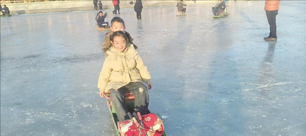 又到了一年一度滑冰的好时节,1月11日,市人民公园西湖冰面上,孩子们坐在冰车上,不时穿梭而过,好不快乐。(崔建敏 摄)