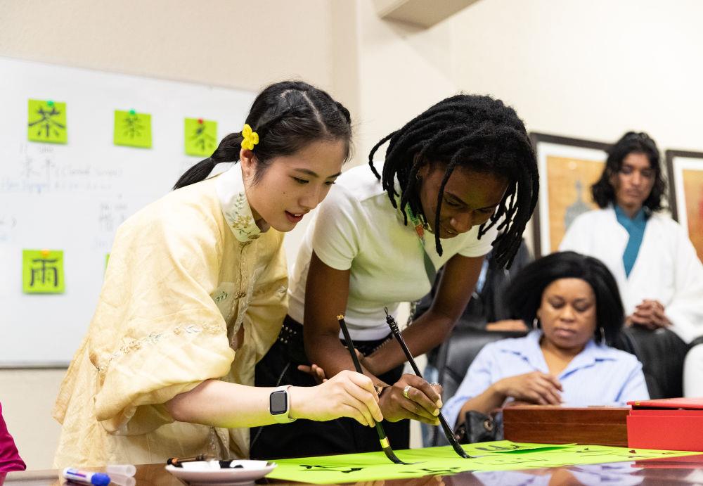 △2025年4月17日,在南非约翰内斯堡,学生与孔子学院志愿者在“国际中文日”活动上写毛笔字。