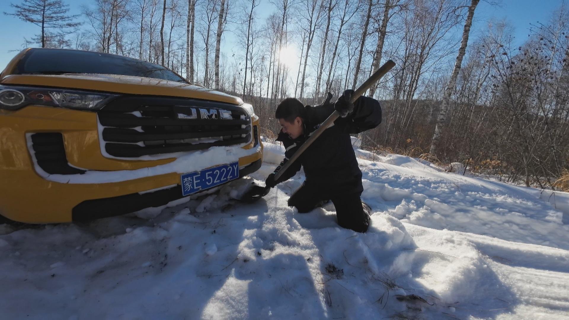 林间背阴路段日照少,积雪被车辆压实后又反复冻结。车辆行至一处背阴弯道,没有躲过暗藏的松软雪层,车先是猛地一顿,随后车轮开始空转,车辆陷在原地动弹不得。柴瑞峰取出铁锹从车轮下挖雪,十几分钟后,积雪才被清理干净。