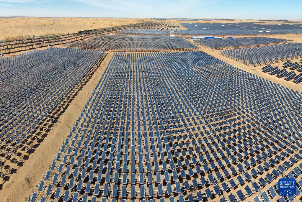 内蒙古库布其沙漠亿利生态示范区立体光伏治沙基地(无人机照片)。新华社记者 李云平 摄