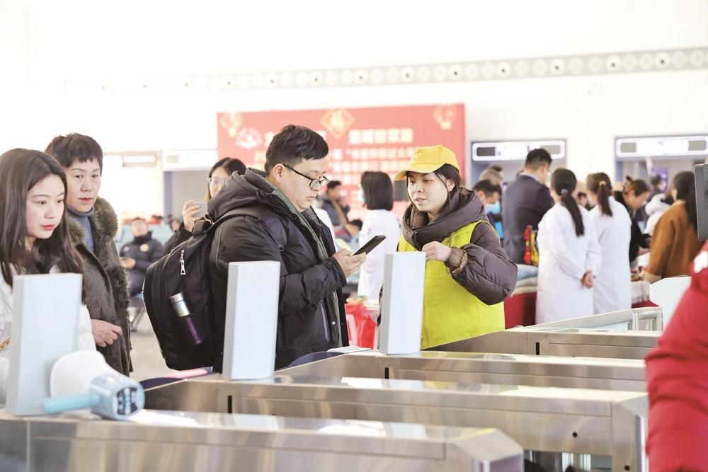 为保障春运期间旅客出行顺畅,志愿者积极投身春运服务保障工作,在乌海站候车厅内开展旅客引导、政策宣传等志愿服务,以实际行动践行志愿精神,助力春运平稳有序。图为2月13日志愿者协助旅客检票。 (赵政宇 摄)