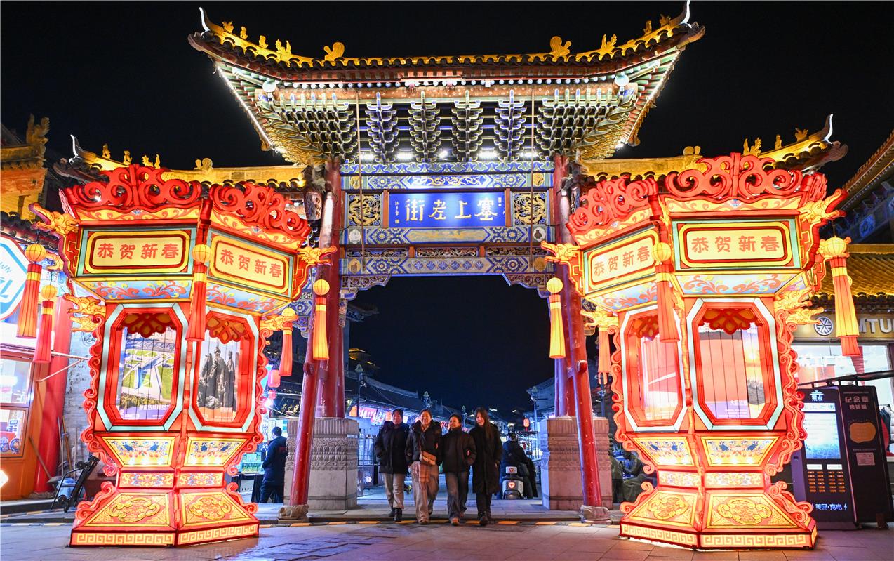 游客在呼和浩特市塞上老街旅游休闲街区观赏花灯。内蒙古日报·草原云记者 孟和朝鲁 摄