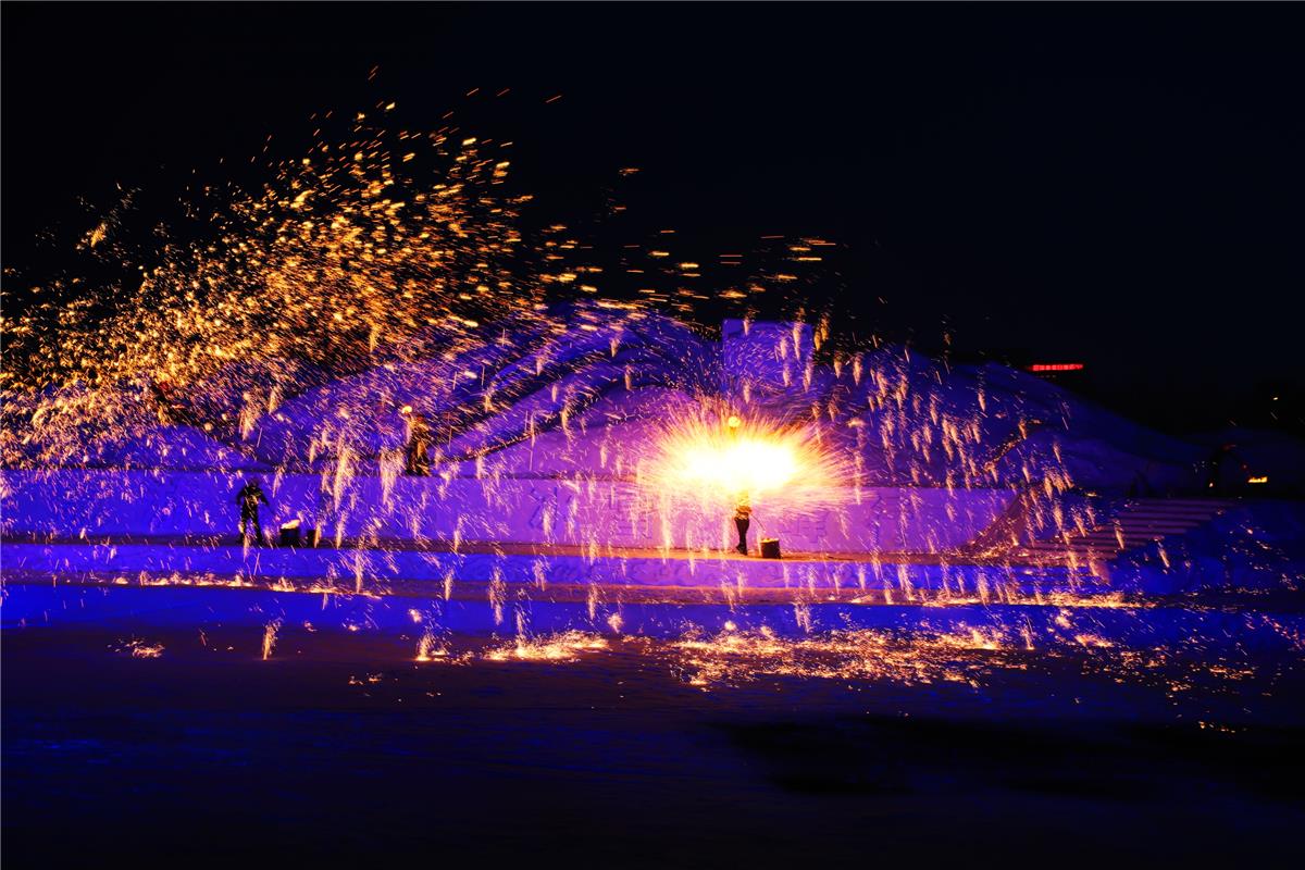 在赤峰市松山区龙城冰雪大世界,打铁花表演精彩上演。李富 摄