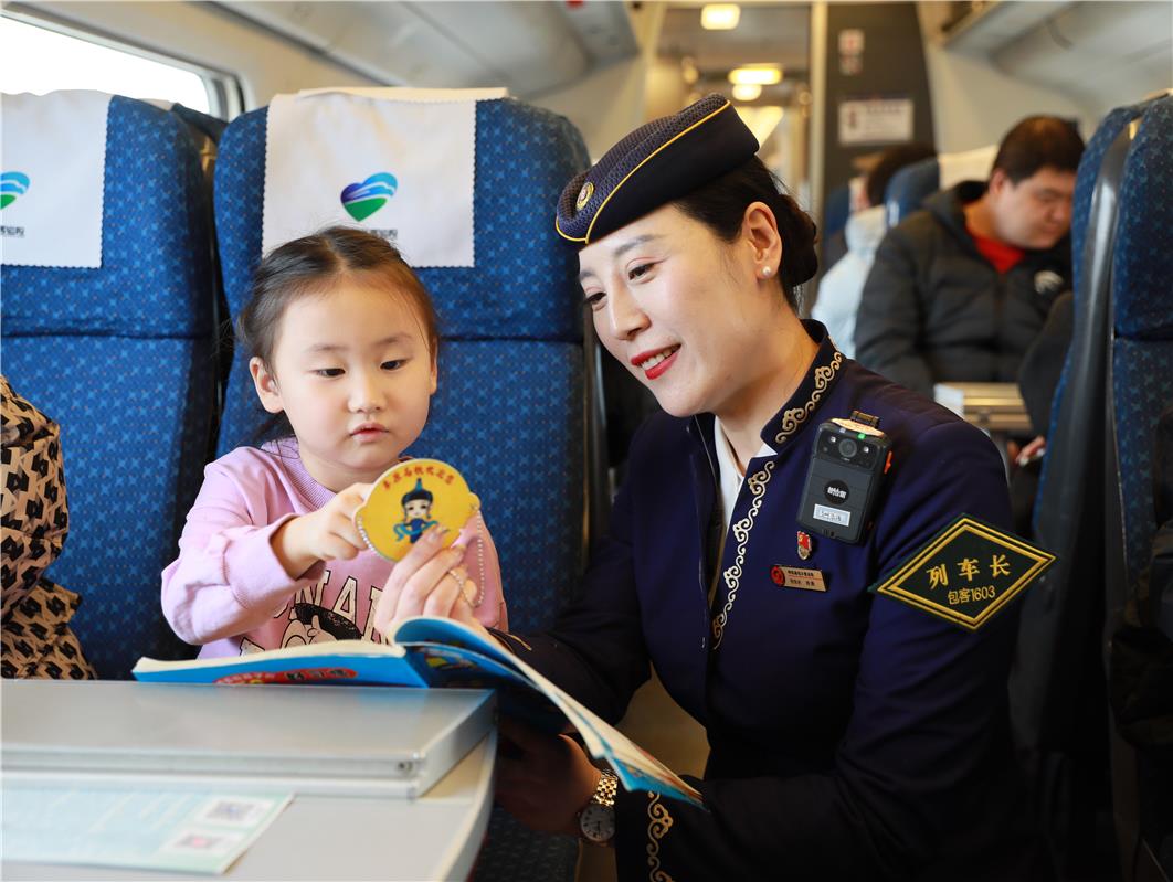 包头客运段乘务人员在列车上与儿童旅客互动。 来敬铮 摄