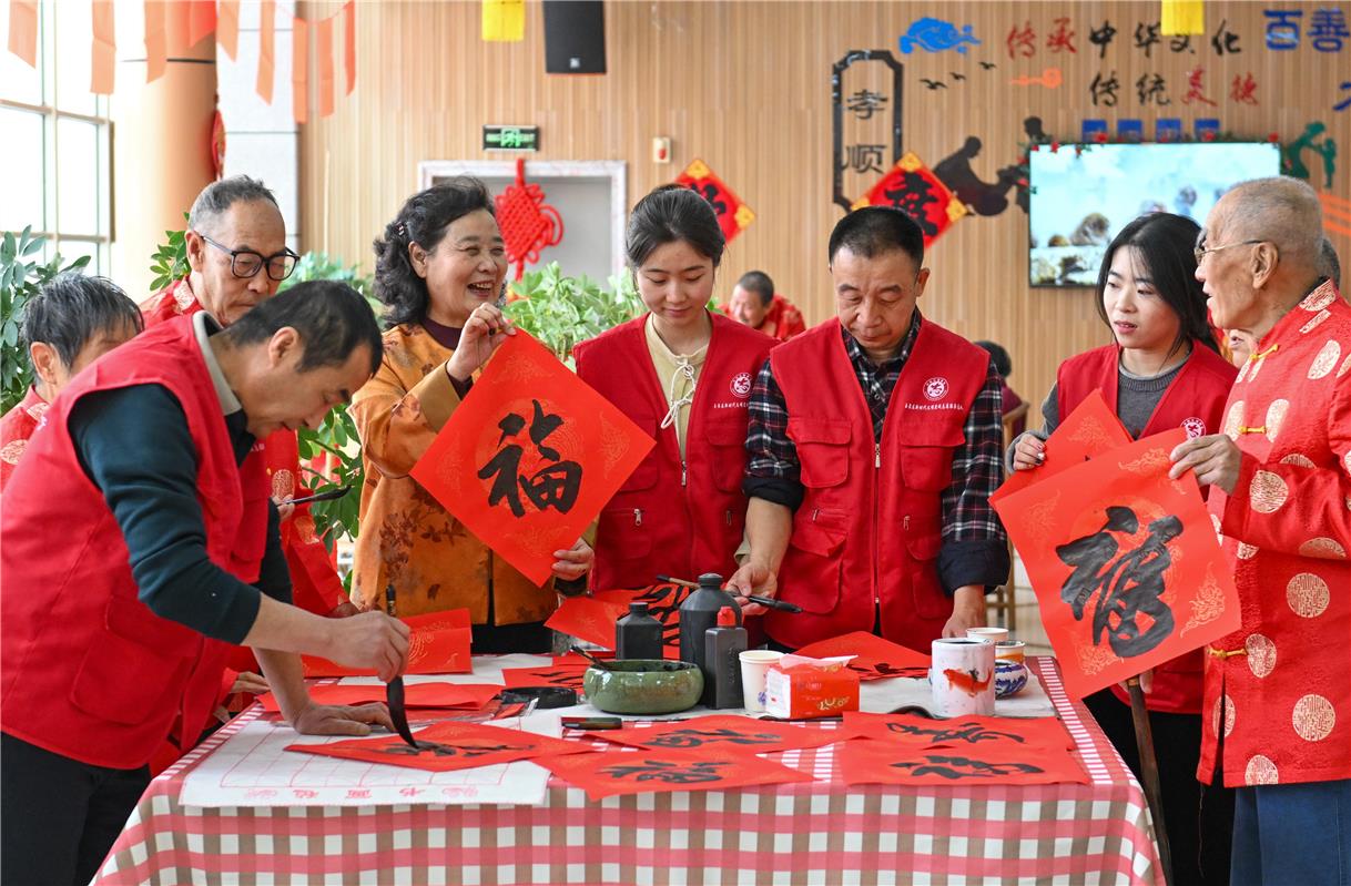 春节前夕,呼和浩特市玉泉区民政局组织志愿者走进金河夕阳红康乐园,为老人们写“福”字送祝福。 内蒙古日报·草原云记者 王磊 摄