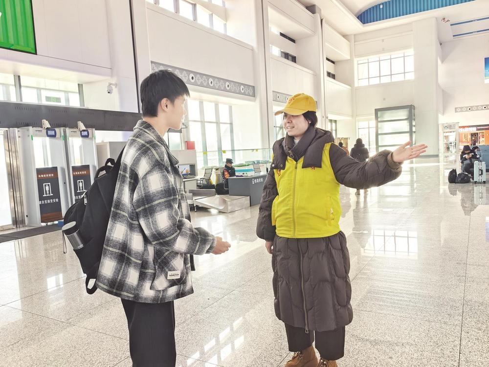 春运期间,青年志愿者积极投入春节假期服务保障工作,在乌海站为有需要的旅客提供候乘引导、信息问询、提拿行李等暖心服务,保障旅客安全、顺畅、温馨出行。(刘洋 摄)