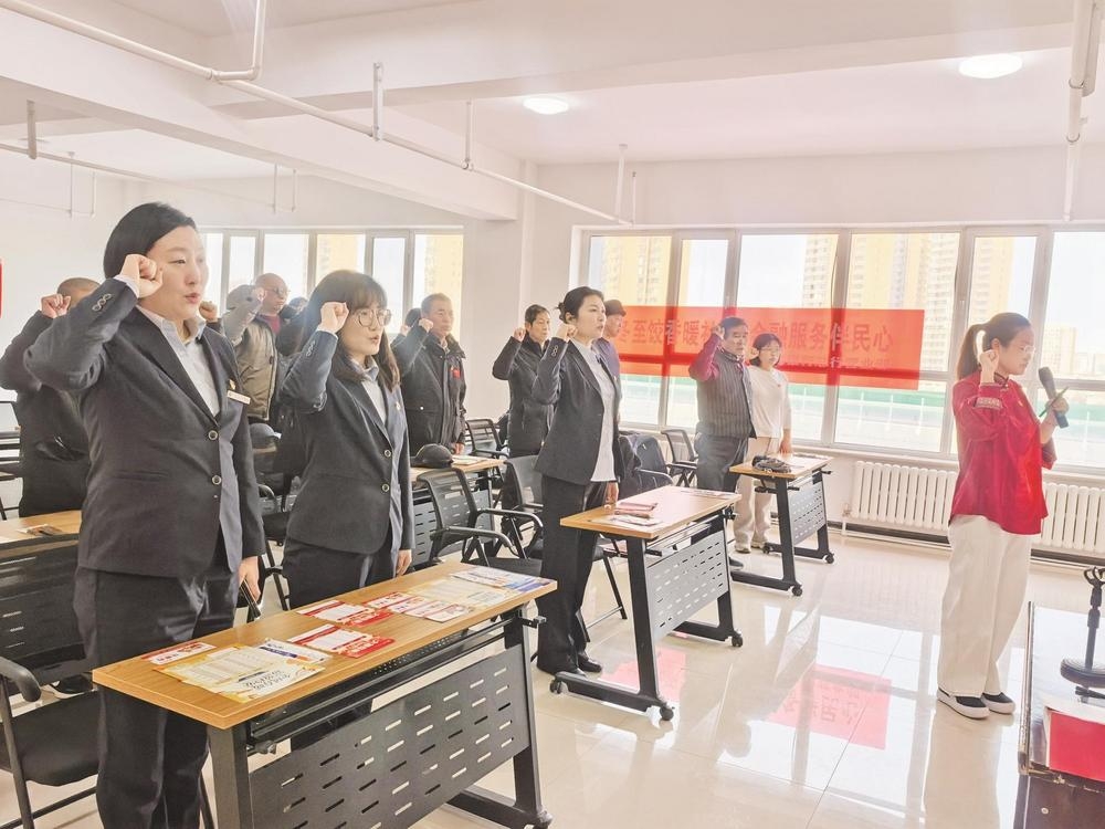 近日,中行乌海分行第六党支部与海勃湾区海北街道东环路社区党委联合开展主题党日活动,重温入党誓词,开展集体学习及反诈消保知识宣传。 (张欣然 摄)
