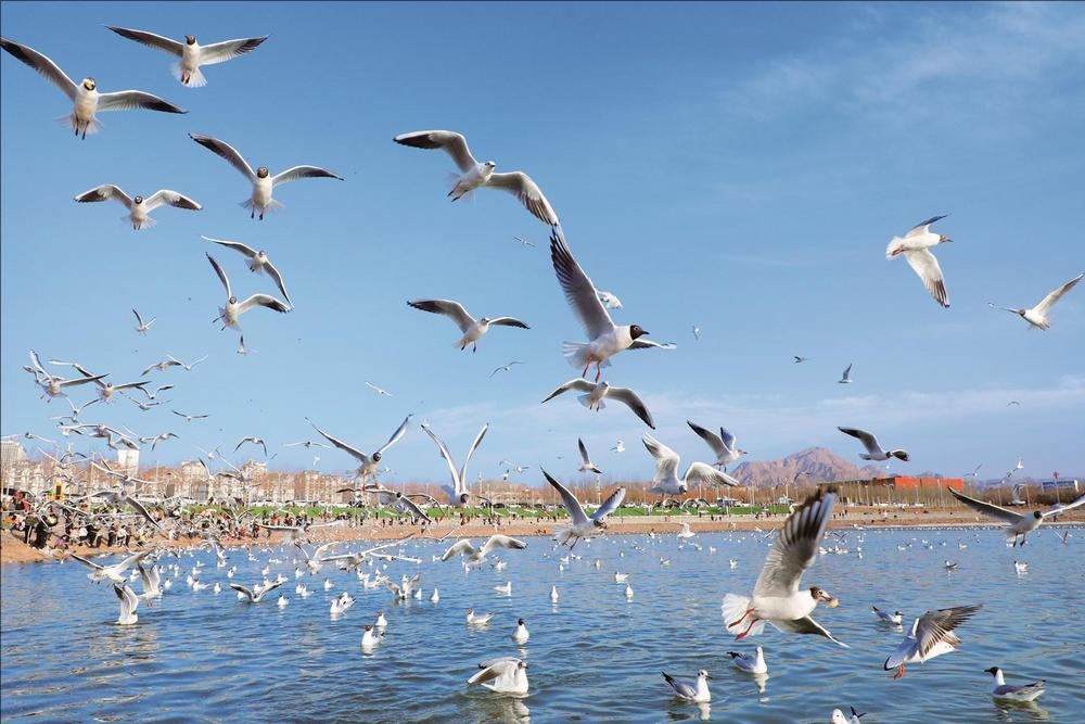 阳春三月,乌海的老朋友红嘴鸥又一次飞回乌海湖畔,引来无数市民游客前来打卡游玩,为春日的乌海增添了勃勃生机。 (崔建敏 摄)