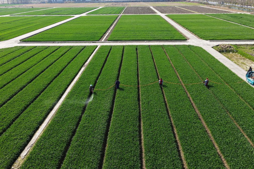 3月10日,农民在江苏里下河地区农科所(扬州市农科院)的麦田间喷洒农药(无人机照片)。新华社发(孟德龙 摄)