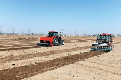 近日,在巴彦淖尔市临河区城关镇蓿亥村田间地头,搭载北斗导航系统的小麦无垄等深匀播机正沿着预设路线匀速作业。 胡东育 摄