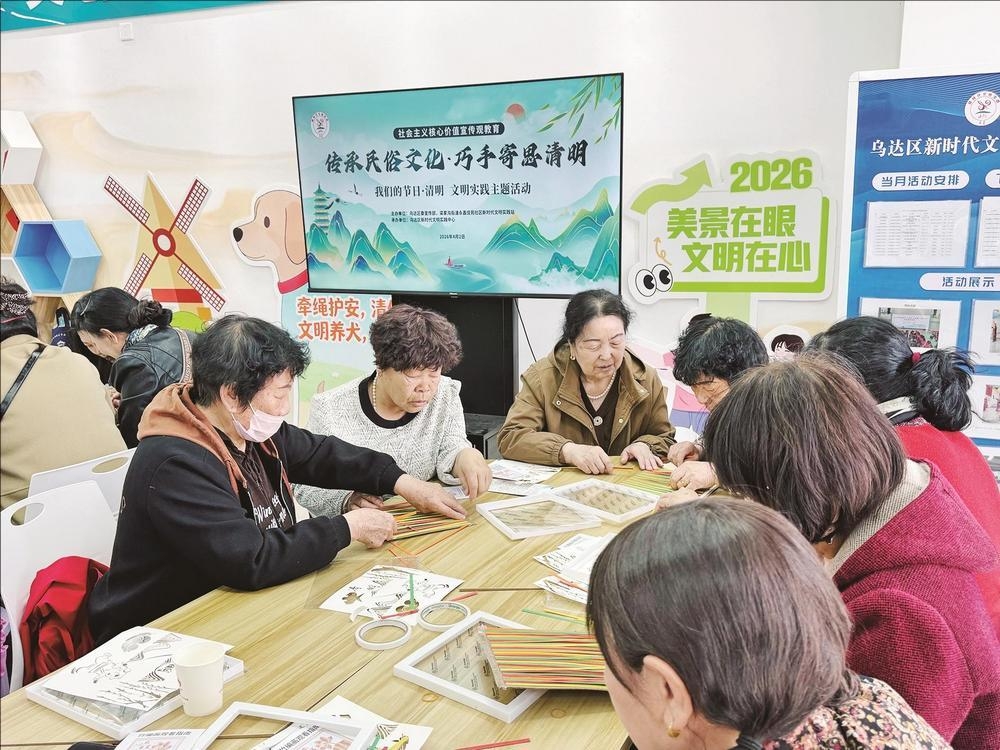 4月2日,乌达区新时代文明实践中心开展“传承民俗文化·巧手寄思清明”——“我们的节日·清明”文明实践主题活动,邀请居民制作谷物画、竹编画。 (段维娜 摄)