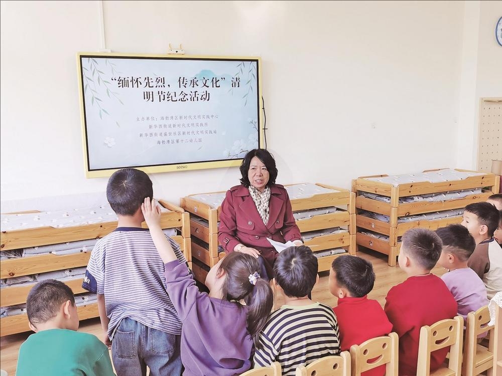 近日,新华西街道盛世社区新时代文明实践站携手海勃湾区第十二幼儿园,开展“缅怀先烈,传承文化”清明节主题活动,让孩子们在沉浸式体验中铭记历史、感悟英烈精神,让红色基因与传统文化扎根童心。 (斯琴满都海 摄)