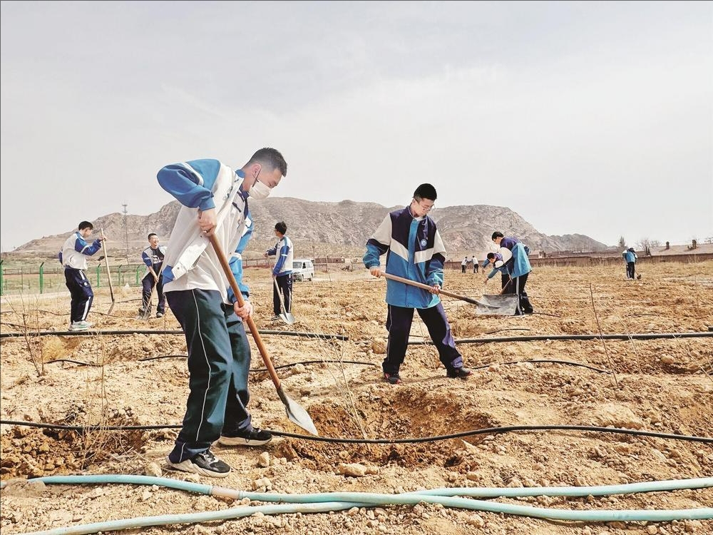 4月2日,共青团海南区委员会联合乌海市第十九中学,在乌海第一党支部开展“赓续红色血脉 共植青春绿洲”义务植树主题实践活动。30名学生代表以青春之名赴时代之约,在沃土种新绿,在实践中淬炼。 (段维娜 摄)