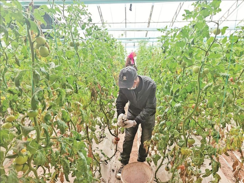 曙光村村民在高效农业示范园冬暖式大棚里采摘西红柿,准备出售。