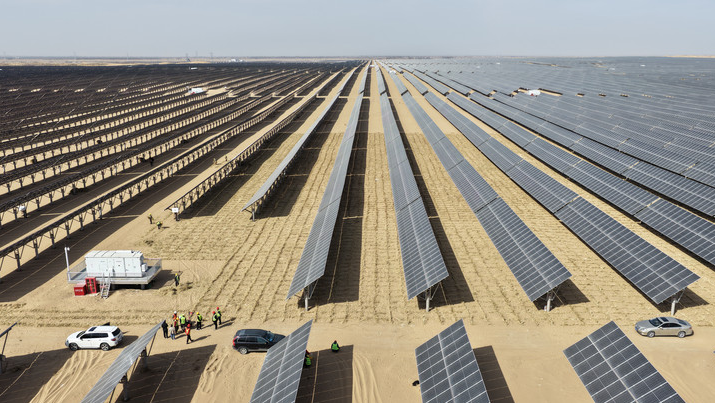内蒙古巴彦淖尔市乌拉特前旗苏计沙地光伏治沙项目区。新华社发
